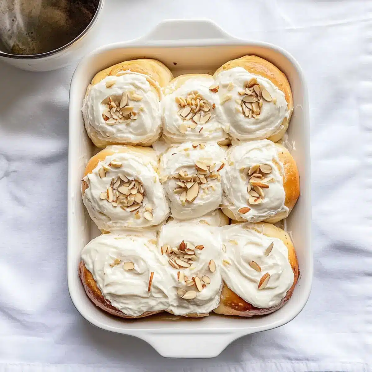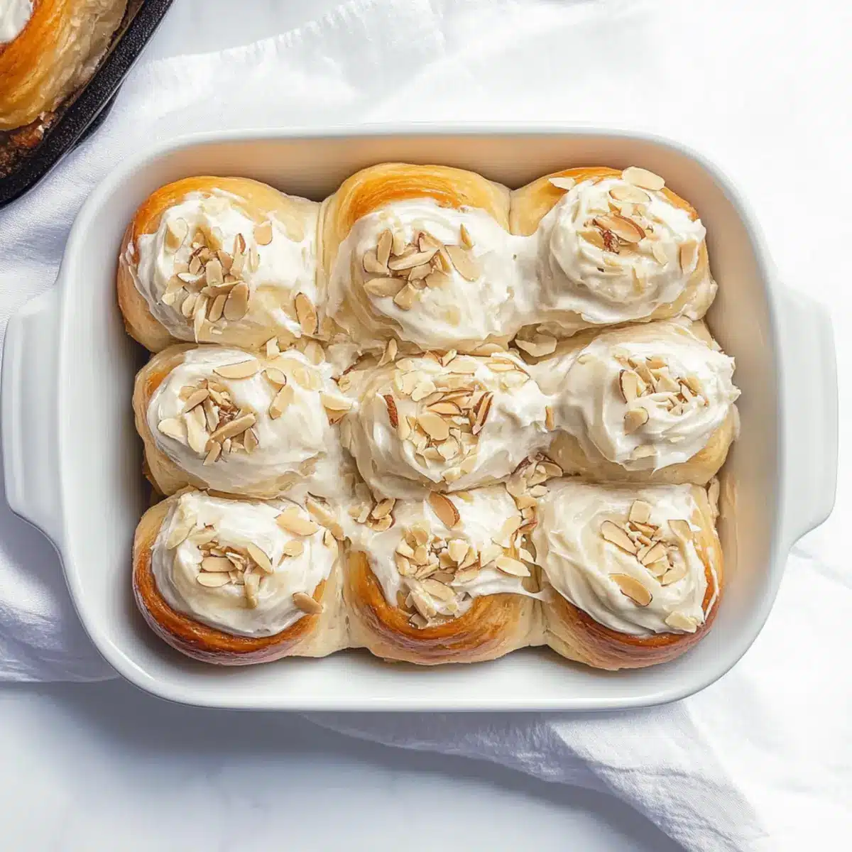 Once the rolls have cooled for about 10 minutes, spread the creamy frosting generously over the top of the warm rolls. To finish, sprinkle slivered almonds on top for an added crunch and nutty flavor, transforming your Almond Sweet Rolls into an irresistible treat perfect for breakfast or a delightful afternoon snack.