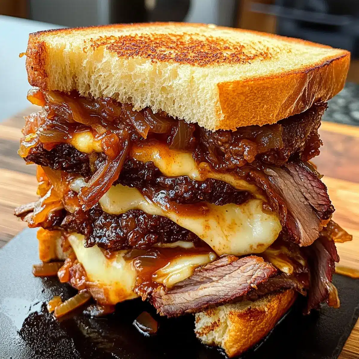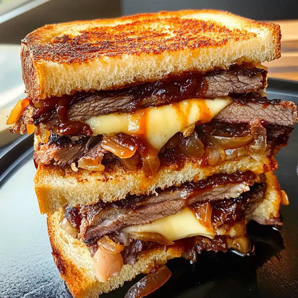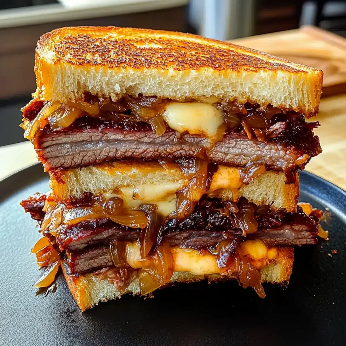 - Assemble the Melts: Layer smoked brisket, caramelized onions, and cheese between slices of sourdough bread.