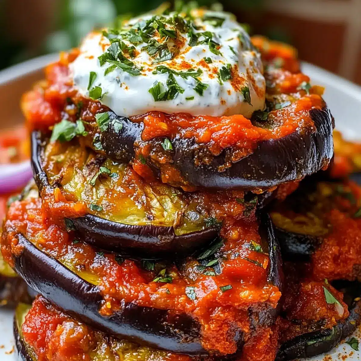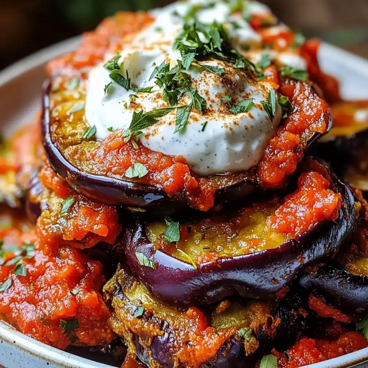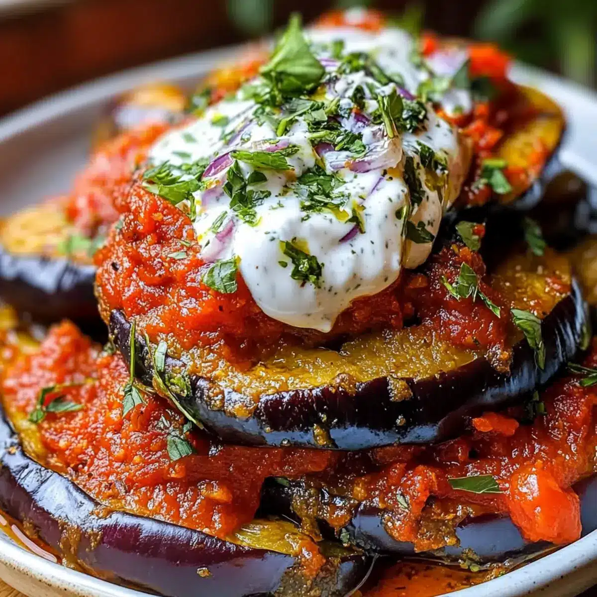 - Layer crispy fried eggplant in a serving dish, pour spiced tomato sauce over it, and add dollops of herbed yogurt.