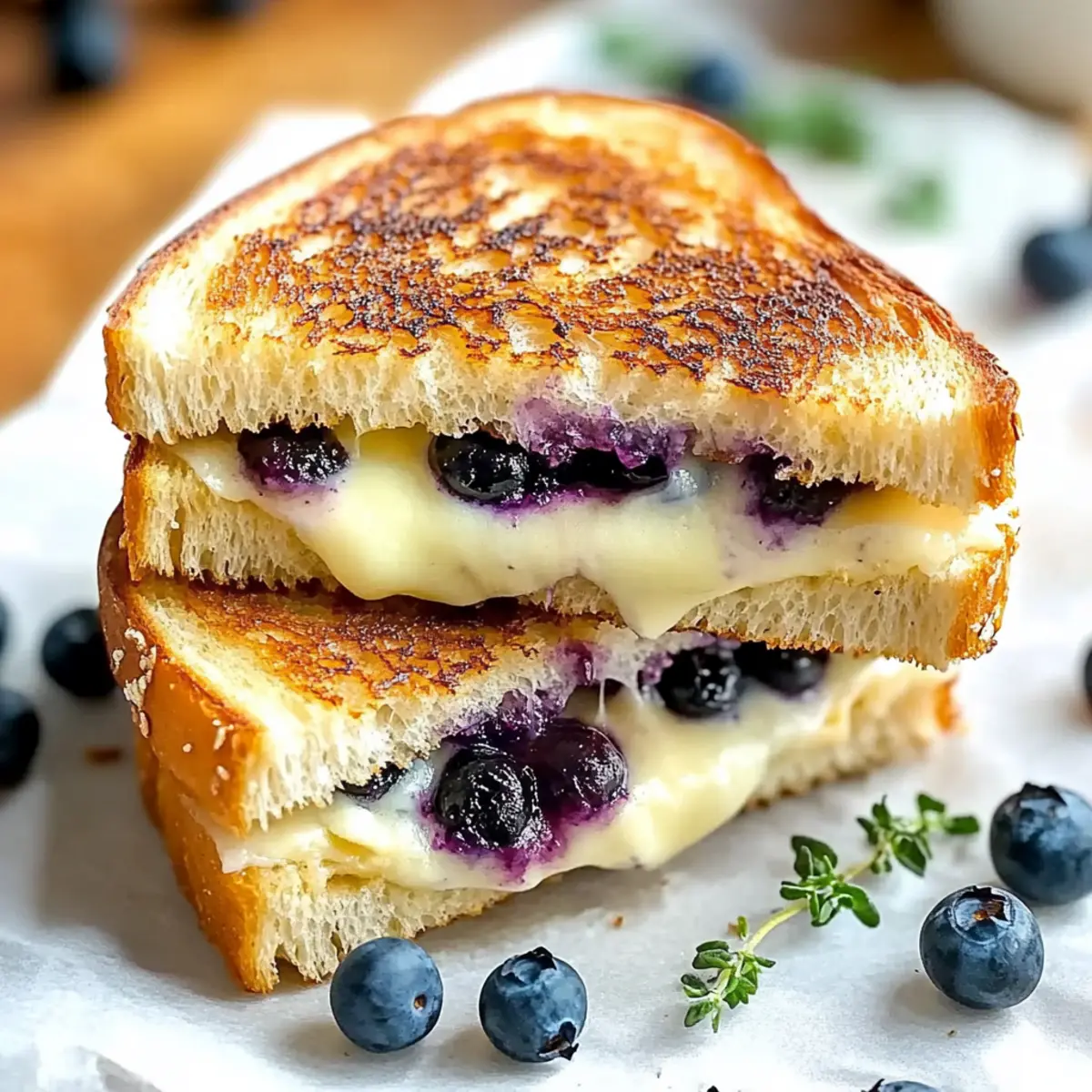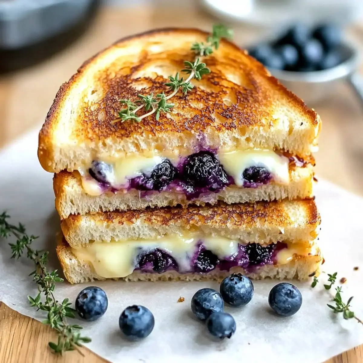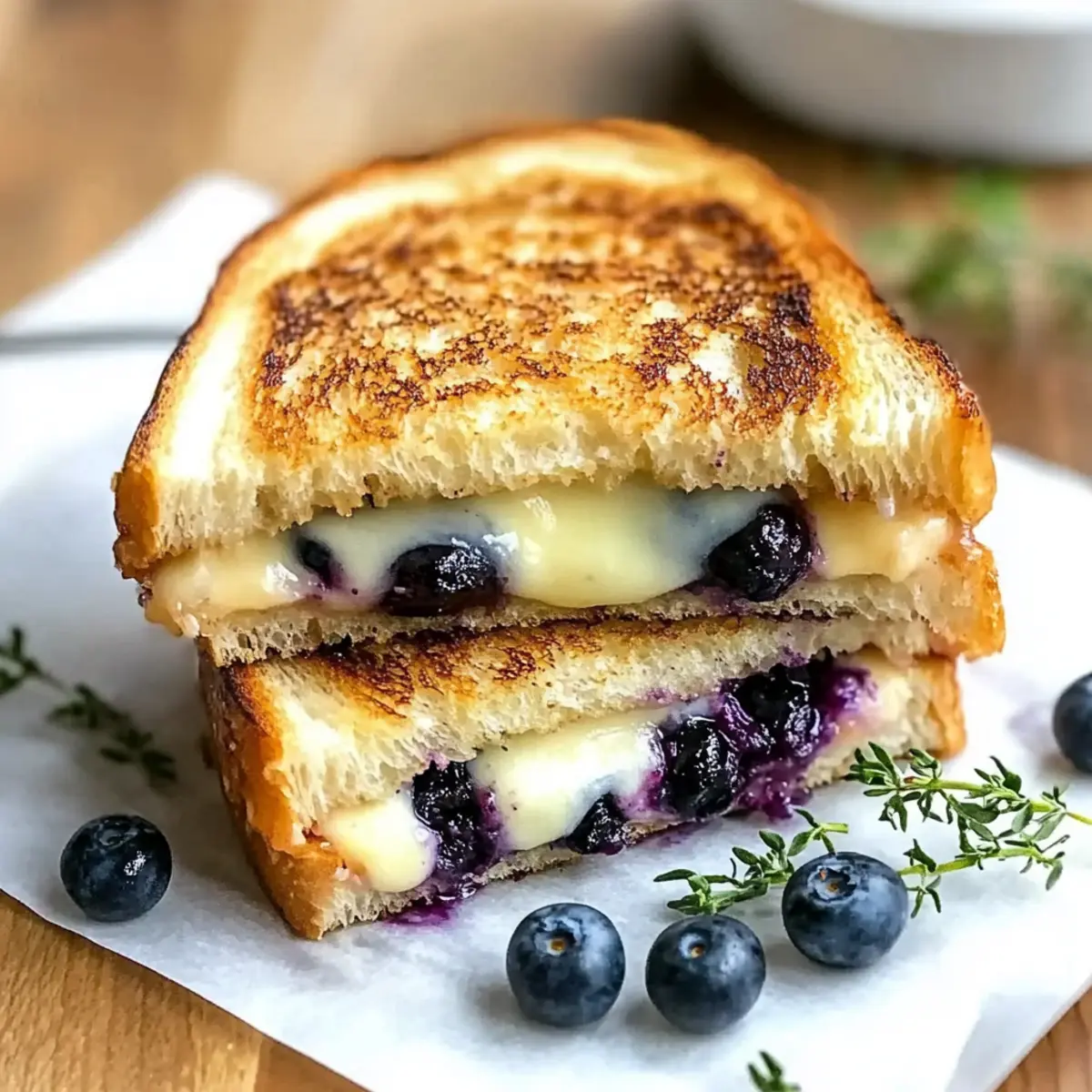 After grilling, remove the crispy blueberry grilled cheese sandwiches from the skillet and transfer them to a cutting board. Let them rest for a minute before slicing them in half to reveal the gooey melted cheese and luscious blueberry compote inside. For an elegant touch, sprinkle with a bit of flaky sea salt and optional fresh thyme before serving to complement the sweet and savory flavors beautifully.