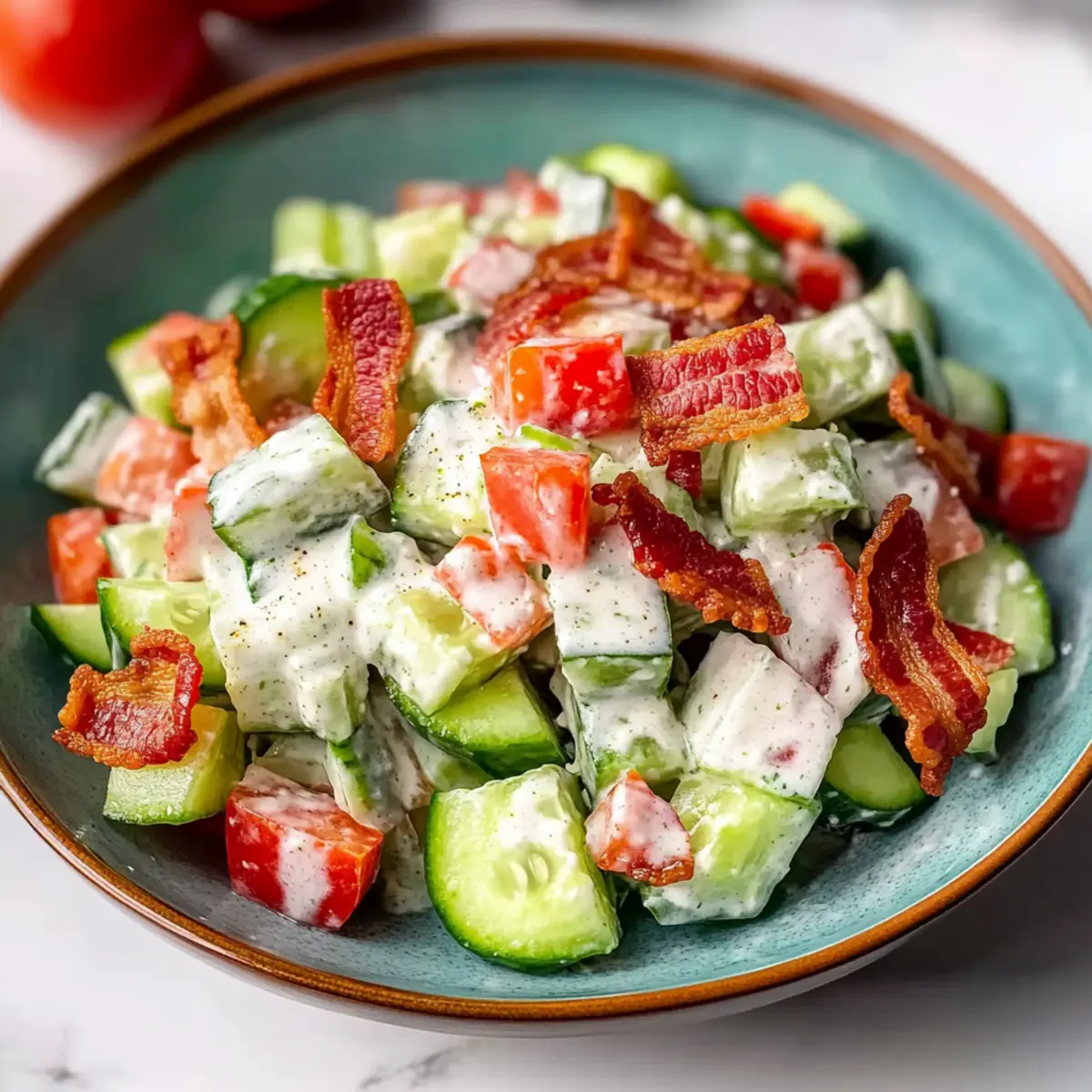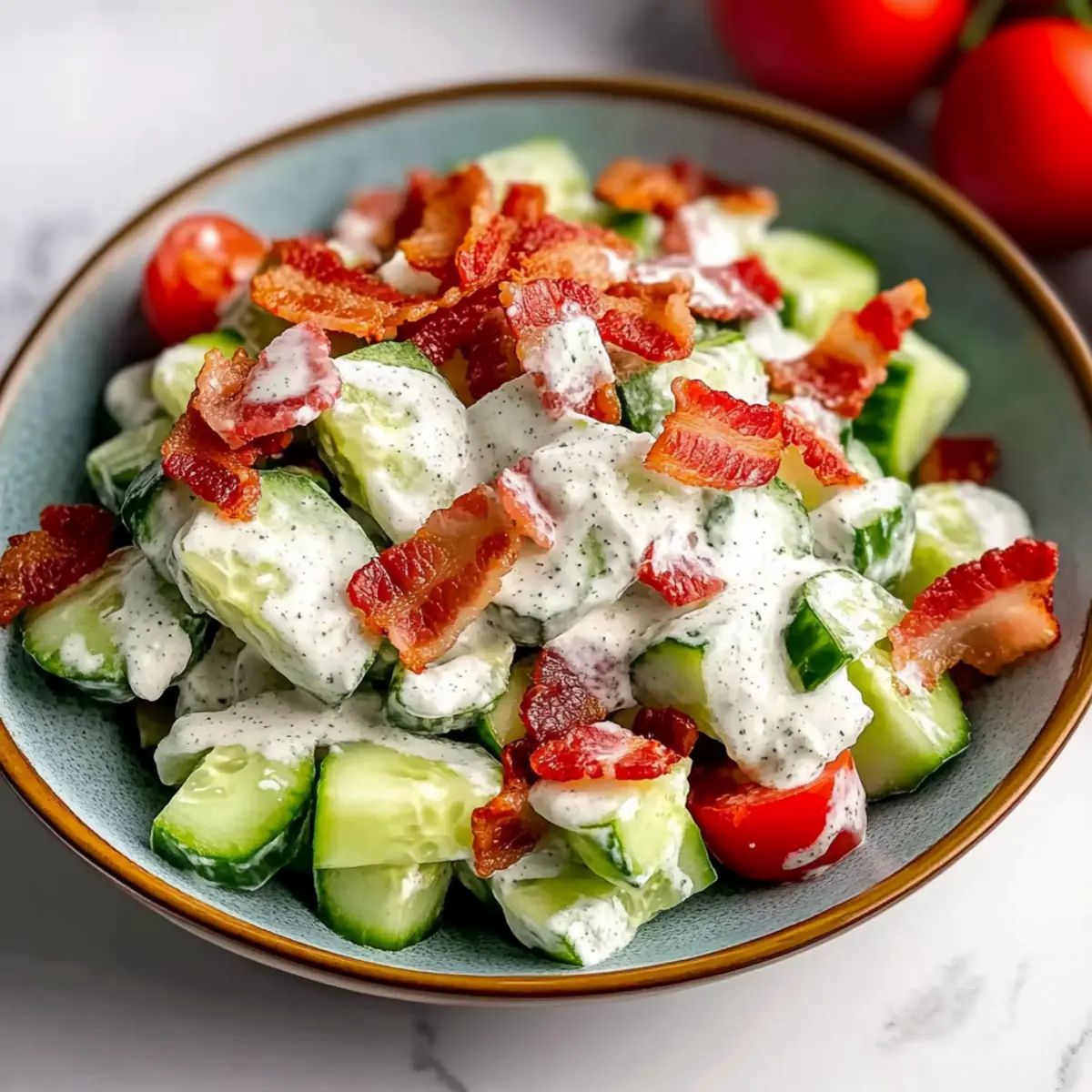 These Crunchy Cucumber Salad with Bacon components are perfect for meal prep, saving you precious time on busy summer days! You can prepare the creamy dressing and chop the cucumbers and tomatoes up to 24 hours in advance. Simply mix the sour cream with ranch seasoning and store it in an airtight container in the fridge. Slice the cucumbers and tomatoes but keep them in separate containers to prevent moisture from causing sogginess. When it’s time to serve, combine the cucumbers and tomatoes with the dressing, then top with crispy bacon for that irresistible crunch. Your salad will be just as delicious and fresh, ready to impress your guests with minimal last-minute effort!