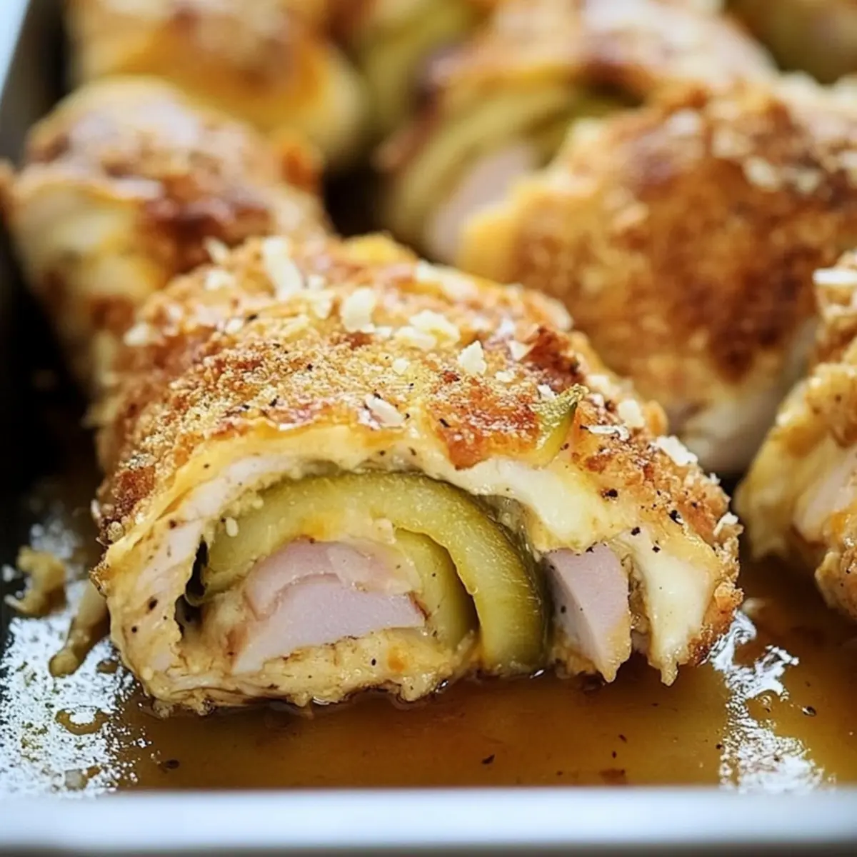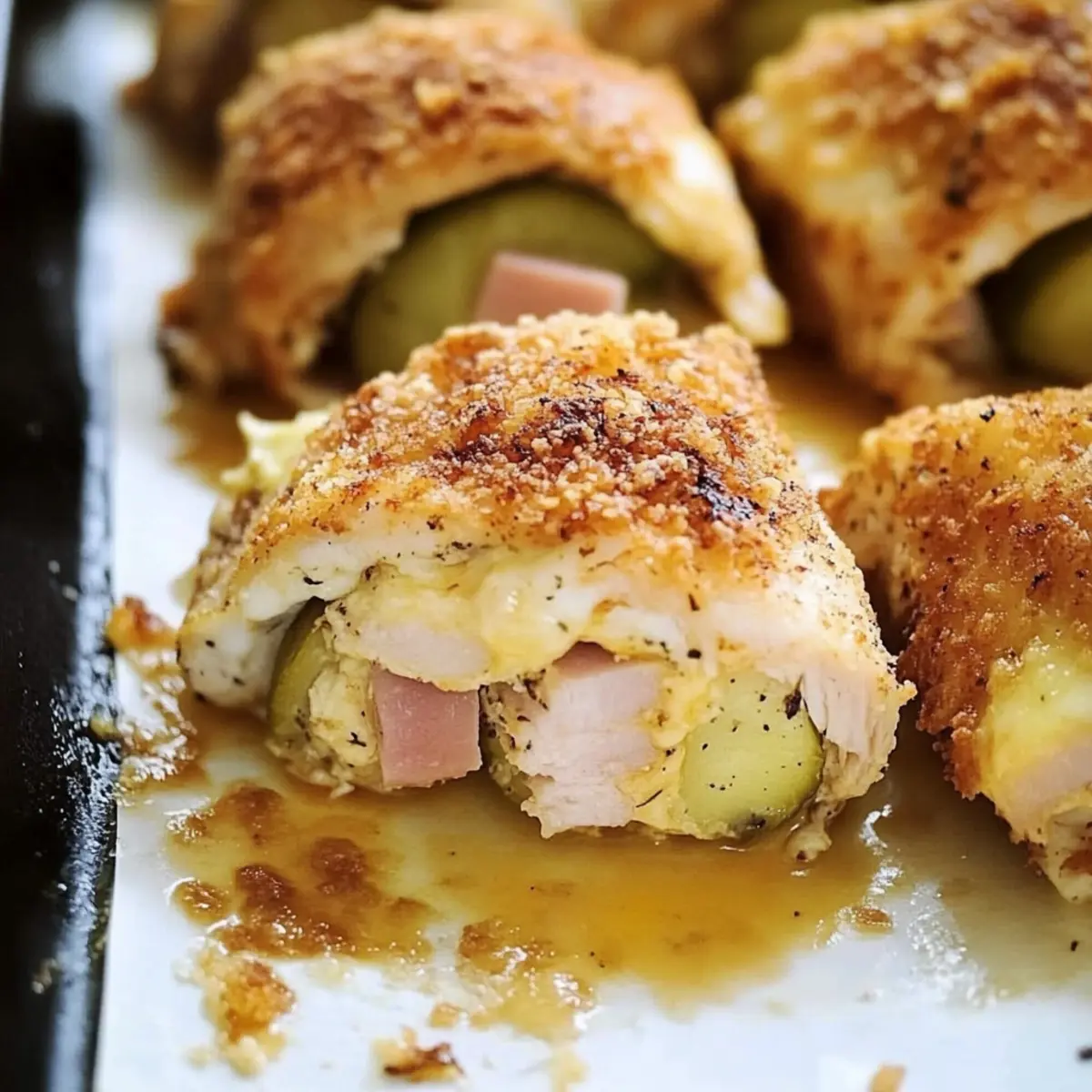 Lay each dried chicken cutlet flat on your counter. Spread approximately 1 teaspoon of deli mustard evenly across each piece, then layer with 2 ounces of thin-sliced ham, 2 ounces of shredded Swiss cheese, and a few slices of dill pickles. Carefully roll each cutlet tightly to enclose the filling completely, creating delightful roll-ups.