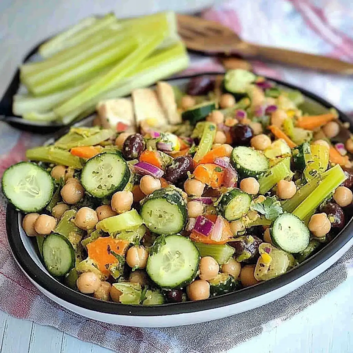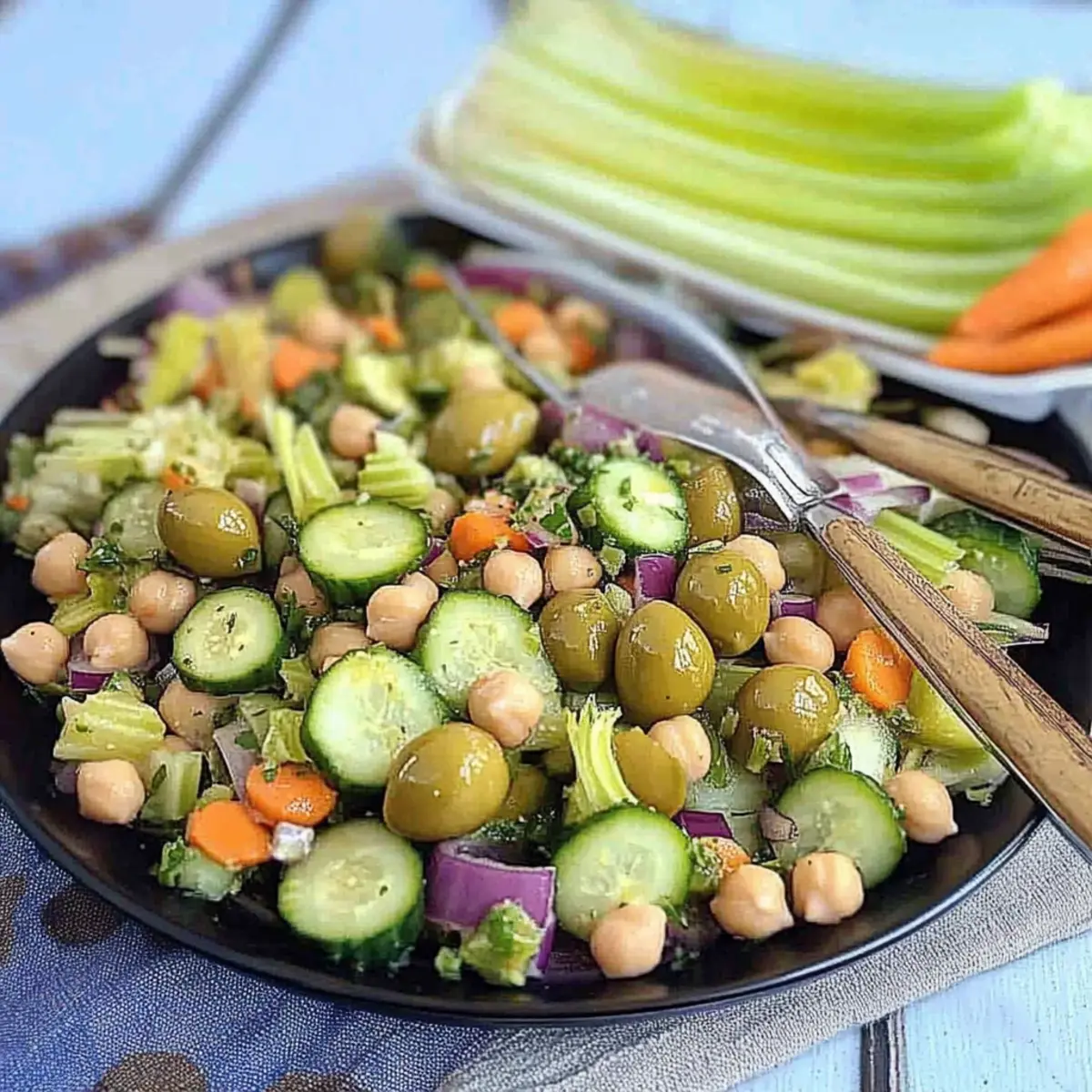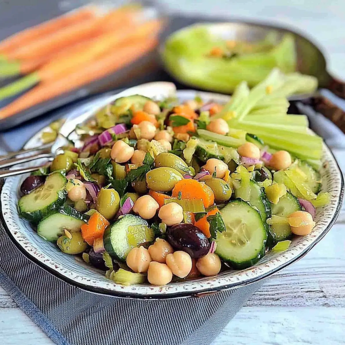 These Cucumber Celery Olive Odyssey Salad is perfect for busy weeknights and meal prep routines! You can chop and prepare the vegetables (cucumbers, celery, carrots, onions, and olives) up to 24 hours in advance, storing them in an airtight container in the refrigerator to maintain their crispness. Additionally, the chickpea mixture can be cooked ahead and refrigerated for up to 3 days; just remember to let it cool before storing to prevent moisture buildup. When you’re ready to serve, simply combine the prepped ingredients, drizzle with lemon juice, and toss everything together for a delightful and refreshing salad that tastes just as delicious as if it were freshly made!