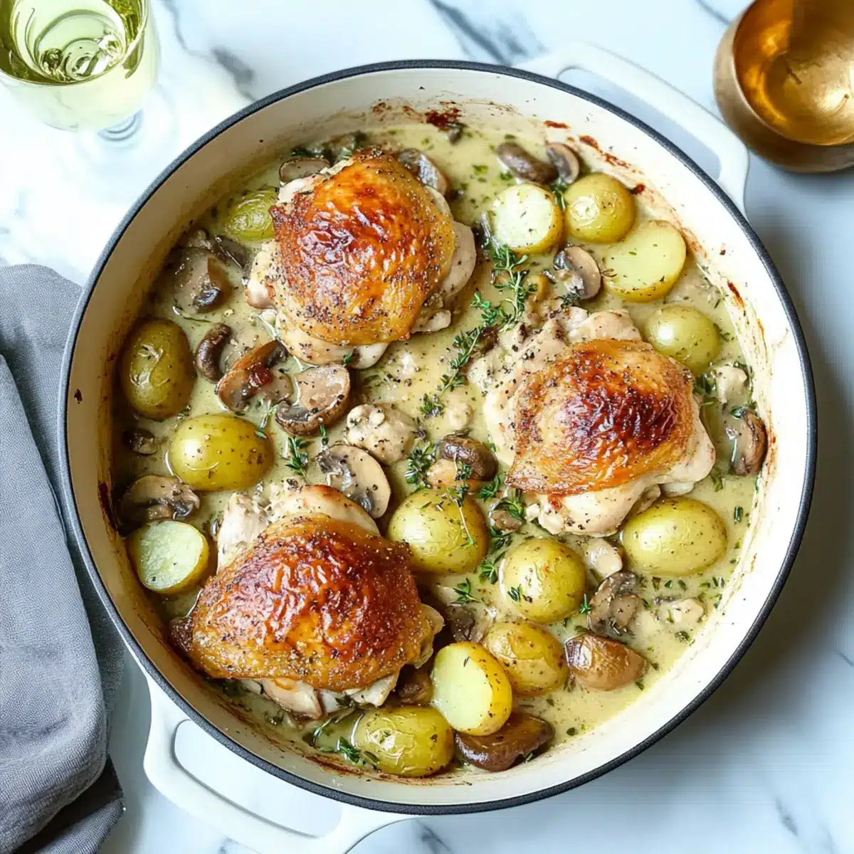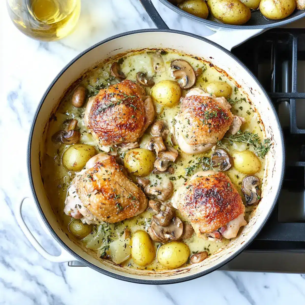 As I stepped into the kitchen, the savory aroma of sizzling chicken hit me like a warm embrace, instantly transporting me to a quaint French bistro. This Cozy French Chicken Casserole with Herbs and Potatoes is everything you crave in comfort food. It showcases golden-brown chicken thighs nestled among tender baby potatoes, drenched in a creamy white wine sauce that’s bursting with fresh rosemary and thyme. Not only is this dish a crowd-pleaser, but it also carries the delightful benefit of being effortlessly assembled, making it perfect for busy weeknights or cozy gatherings. Ready to indulge in a truly hearty meal that fills your home with warmth and nostalgia? Let’s dive into the recipe!