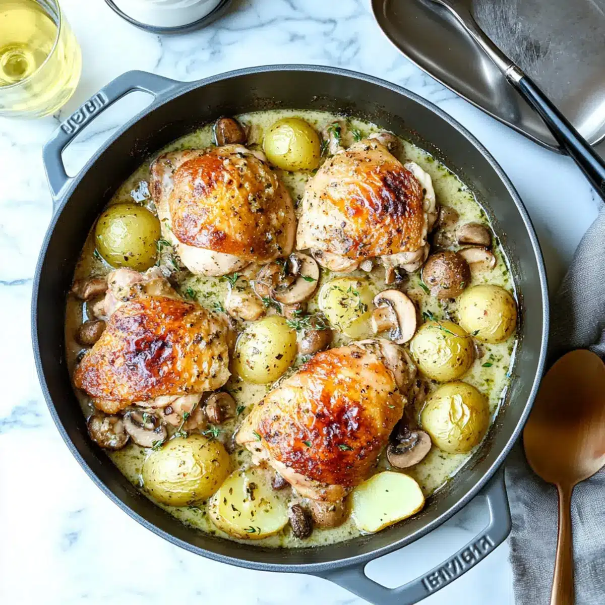 - Bone-in, skin-on chicken thighs – They’re the star of the dish, providing juicy flavor; feel free to swap in chicken breasts if you prefer.