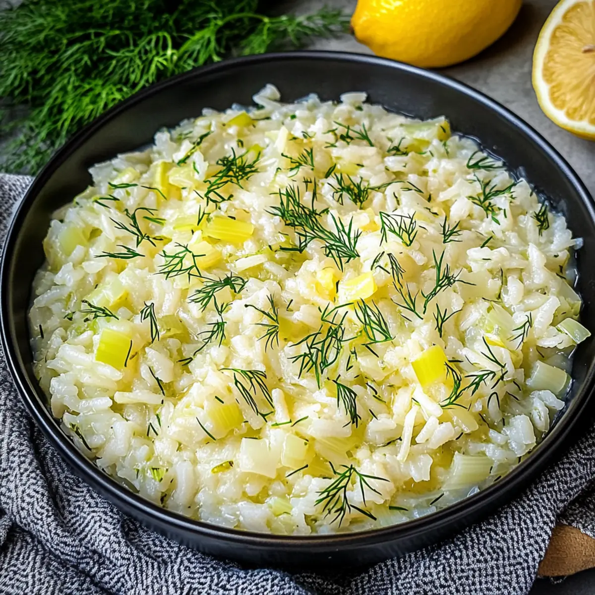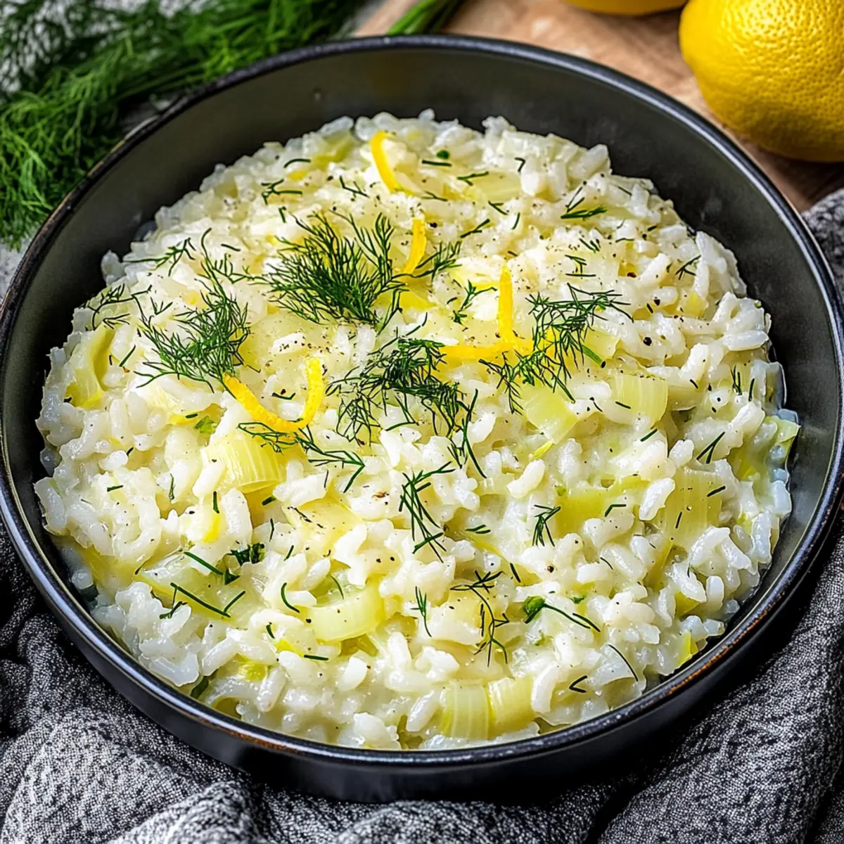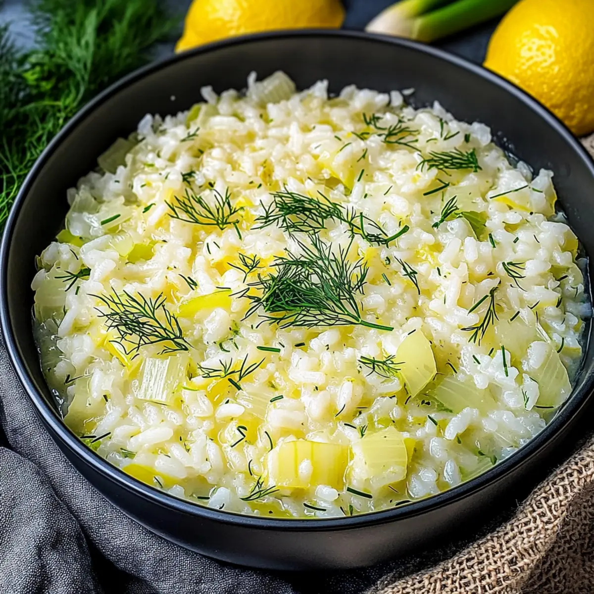Indulge in a delightful spread that perfectly balances the creamy comfort of rice and tender leeks with bright, fresh accompaniments.
