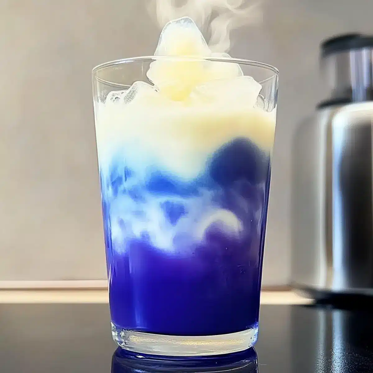 While your blue tea cools, it’s time to create the cold foam. In a blender, combine ⅓ cup of ice-cold milk—use whole, oat, or almond milk based on your preference—and 1 tablespoon of vanilla syrup. Blend for about 10 seconds until the mixture becomes smooth and frothy. If you don’t have a blender, you can also use a frother, a French press, or shake it vigorously in a sealed jar for the same delightful result.