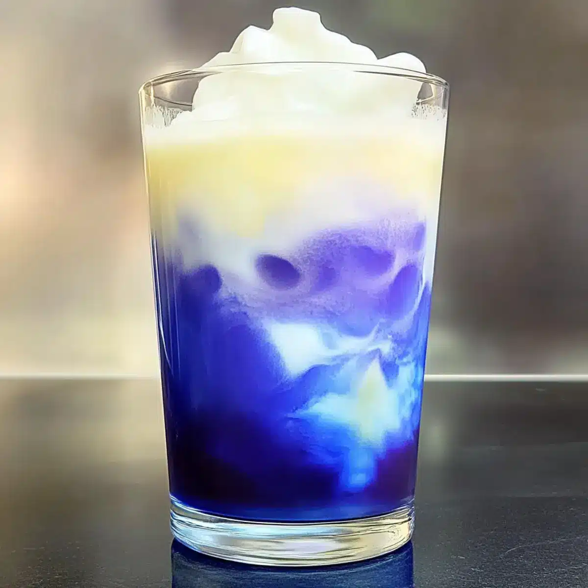 - Assemble the latte in a tall glass with ice cubes, pour in blue tea, then top with cold foam.