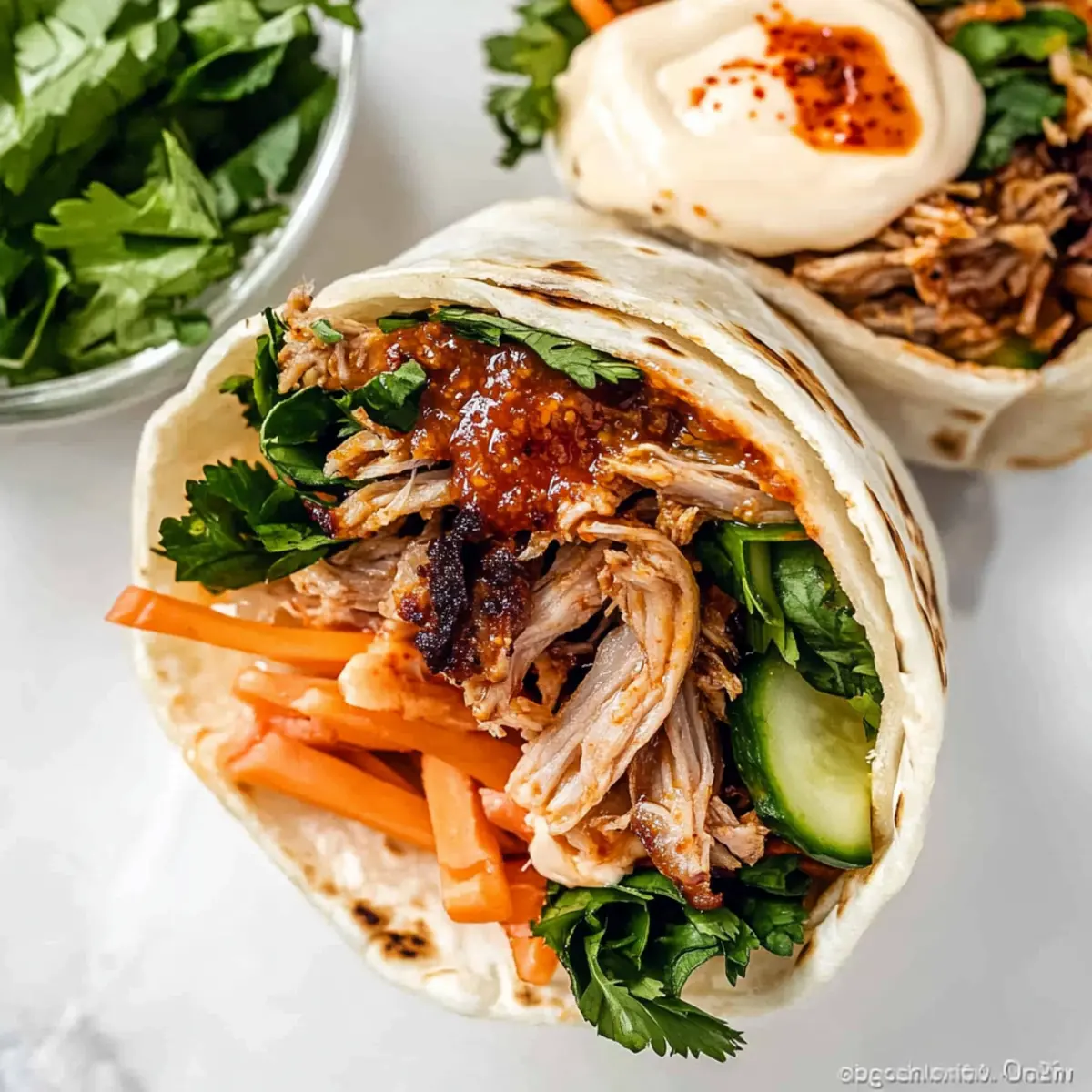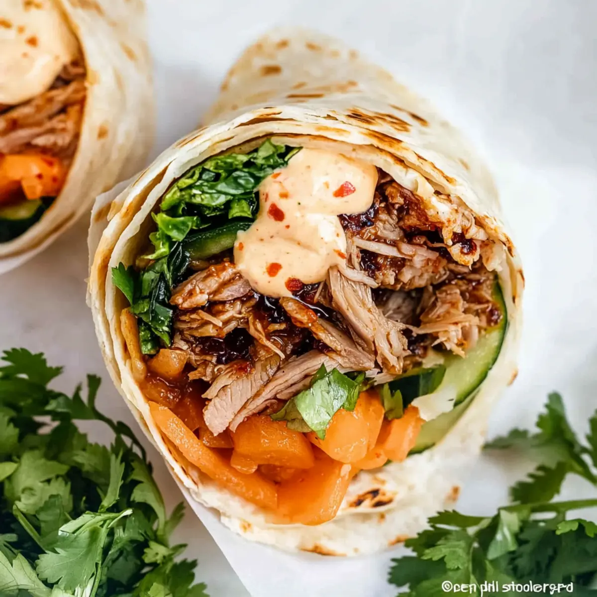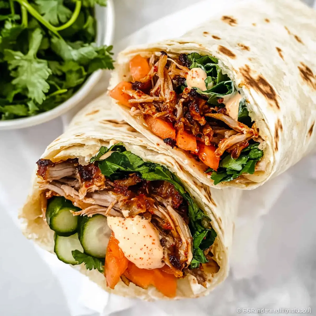 To assemble your Korean burritos, warm the large flour tortillas in the microwave for about 20-30 seconds until they’re pliable. On each tortilla, layer a base of cooked rice, followed by the shredded pork, pickled veggies, and a generous sprinkle of fresh herbs, kimchi, and a dollop of kimchi mayo. Roll the tortilla tightly to encase all the delicious fillings securely.