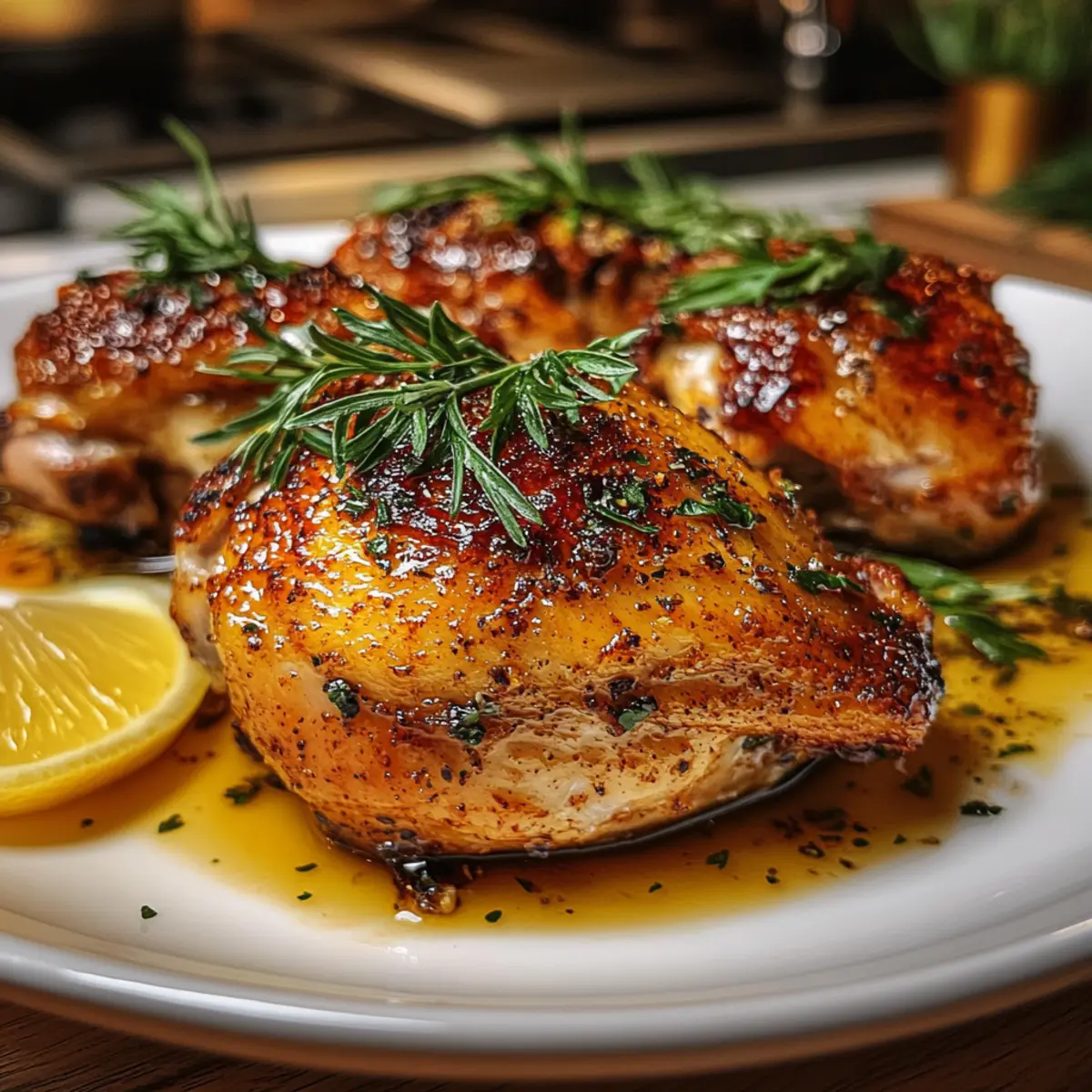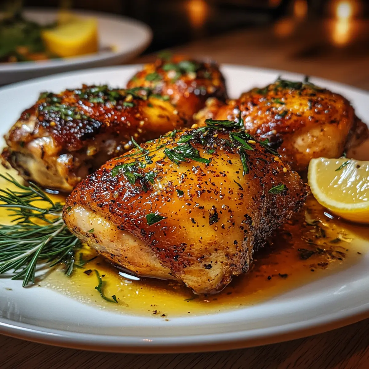 - After roasting, let the thighs rest for 5 minutes before serving. Garnish with fresh herbs and lemon wedges.