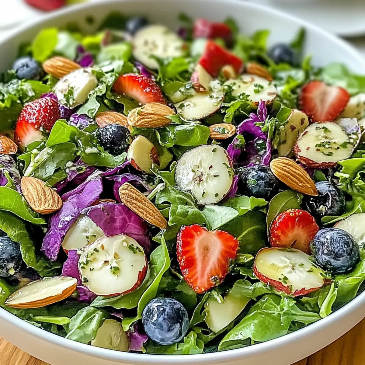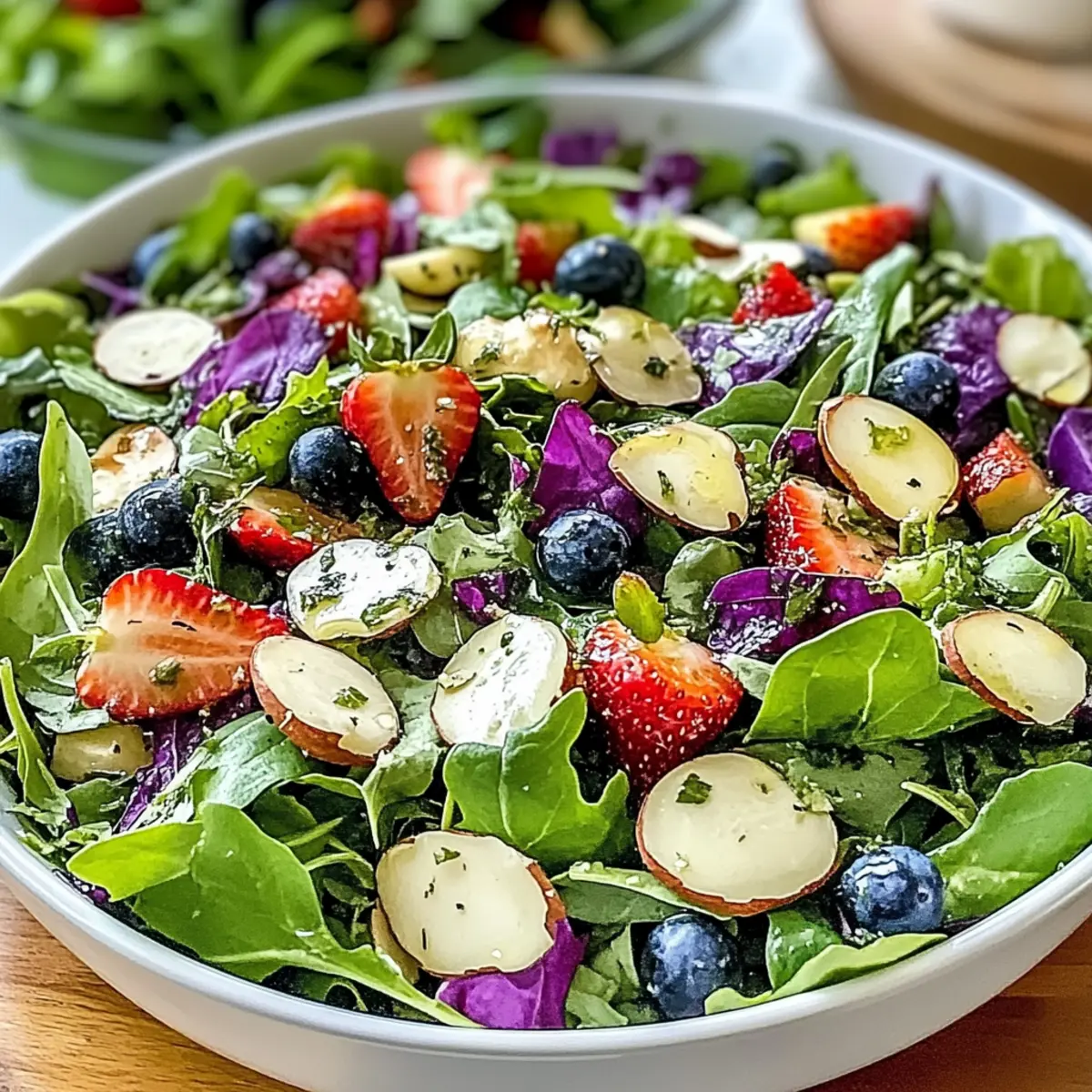 Drizzle the freshly made dressing over the salad components, ensuring everything gets a light coating. Use salad tongs to gently toss the greens, strawberries, and almonds until they are evenly mixed. This final step not only ensures every bite is flavorful but also makes for a visually appealing presentation of your Fresh & Zesty Light Spring Salad. Serve immediately for the best taste and texture!