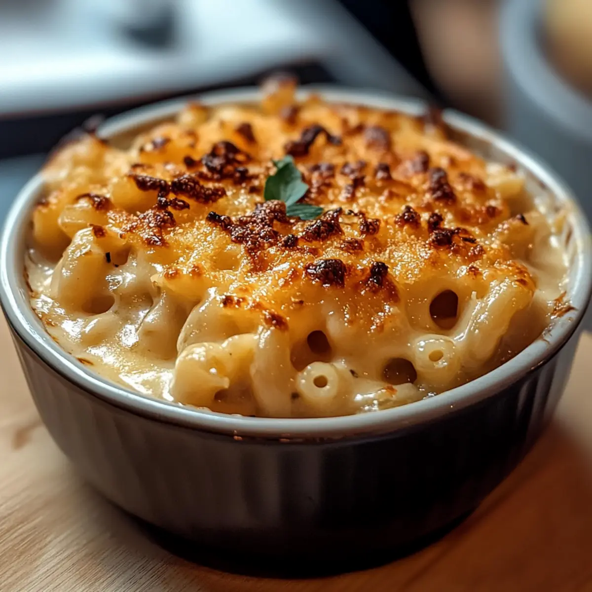 Preheat your broiler while transferring the macaroni and cheese mixture into an oven-safe dish. Sprinkle additional Gruyère and cheddar cheese over the top, and if desired, place toasted baguette slices on top for that classic French onion soup touch. Broil for 3-5 minutes until the cheese is bubbly and golden brown, keeping a close eye to prevent burning.