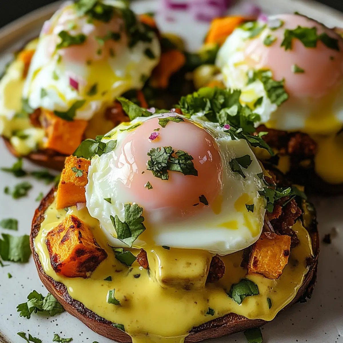 - On each plate, layer roasted sweet potato slices, add crispy chorizo or plant-based protein, top with poached eggs, and drizzle with chipotle hollandaise.