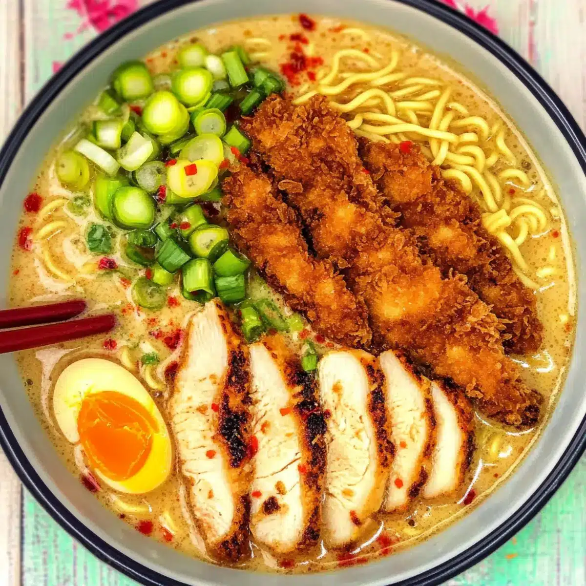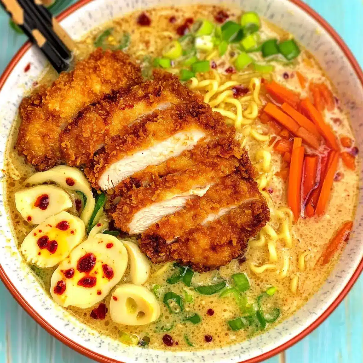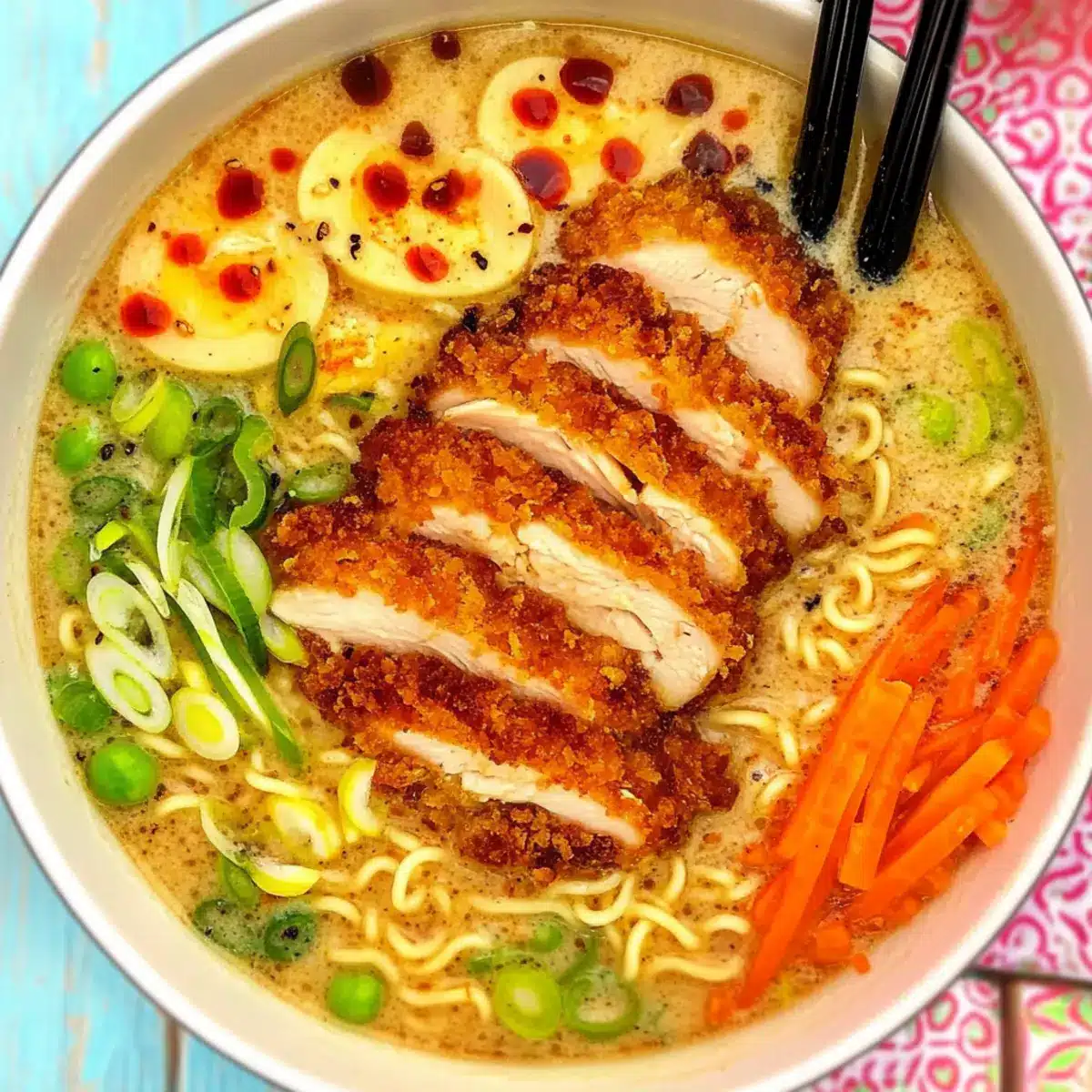 - To serve, divide cooked ramen noodles into bowls, ladle broth over noodles, and top with slices of crispy Chicken Katsu and garnishes.