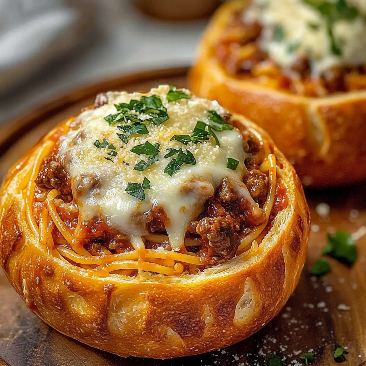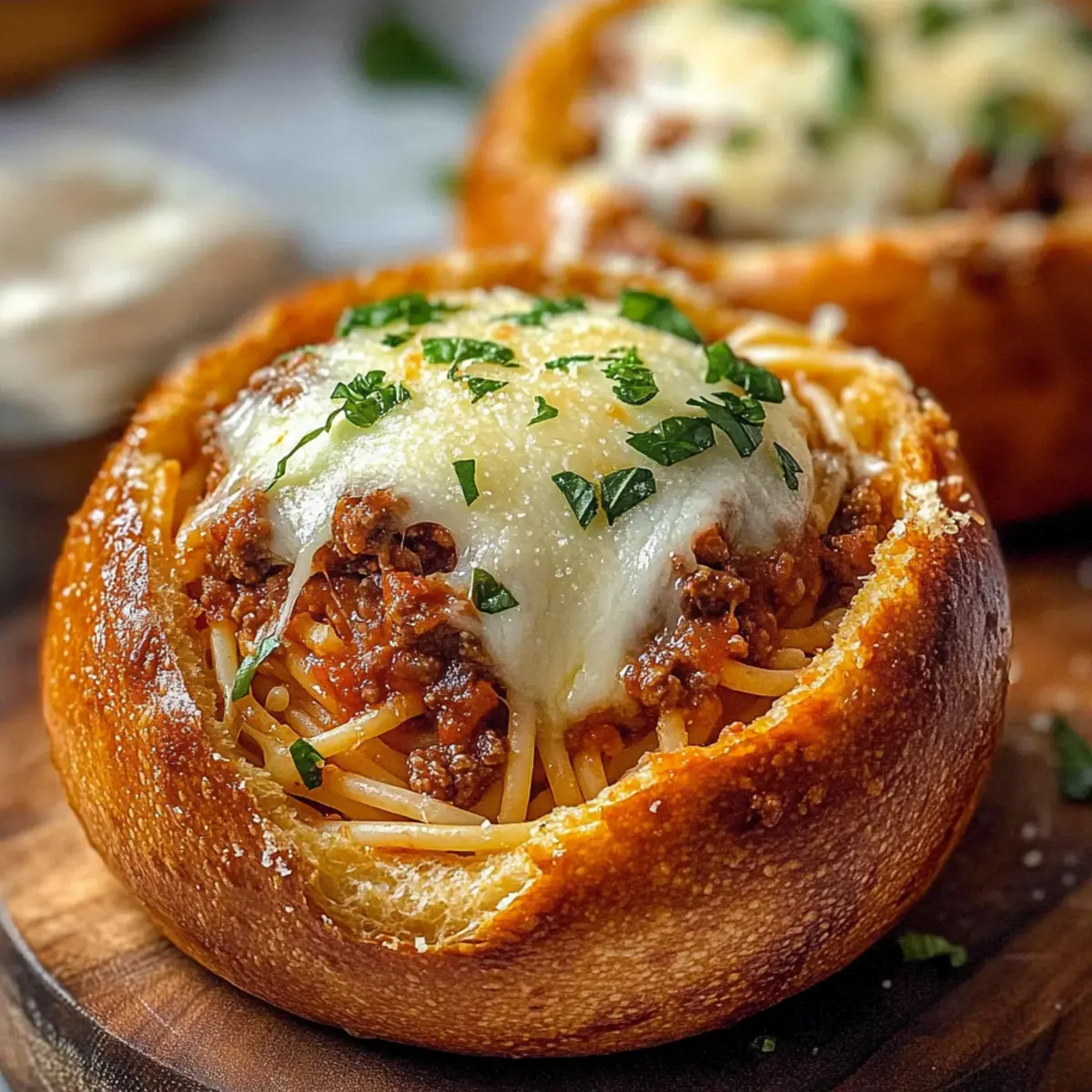 Interactive Dining: Experience the joy of digging into hearty spaghetti nestled inside crispy garlic bread bowls, combining fun with flavor in every bite.