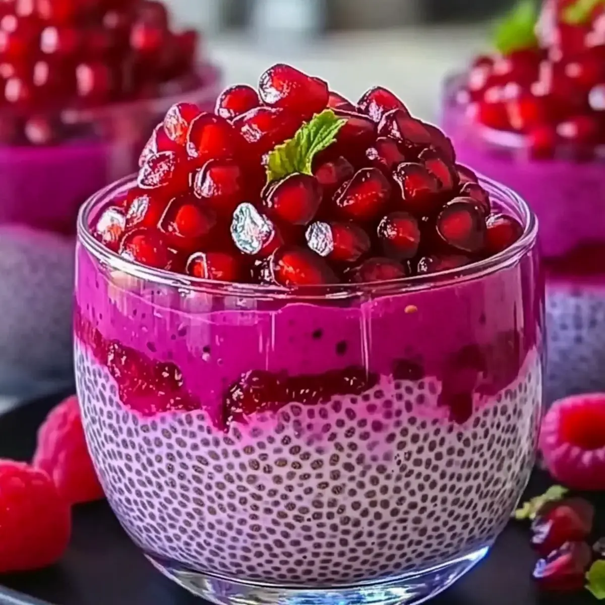After chilling, remove the dessert from the refrigerator and prepare for the final touch. Generously sprinkle fresh pomegranate seeds over each glass, add a few whole raspberries for an eye-catching garnish, and place a mint leaf on top for a refreshing pop of color. Your stunning Pomegranate Raspberry Chia Dessert is now ready to delight your guests or satisfy your sweet cravings!