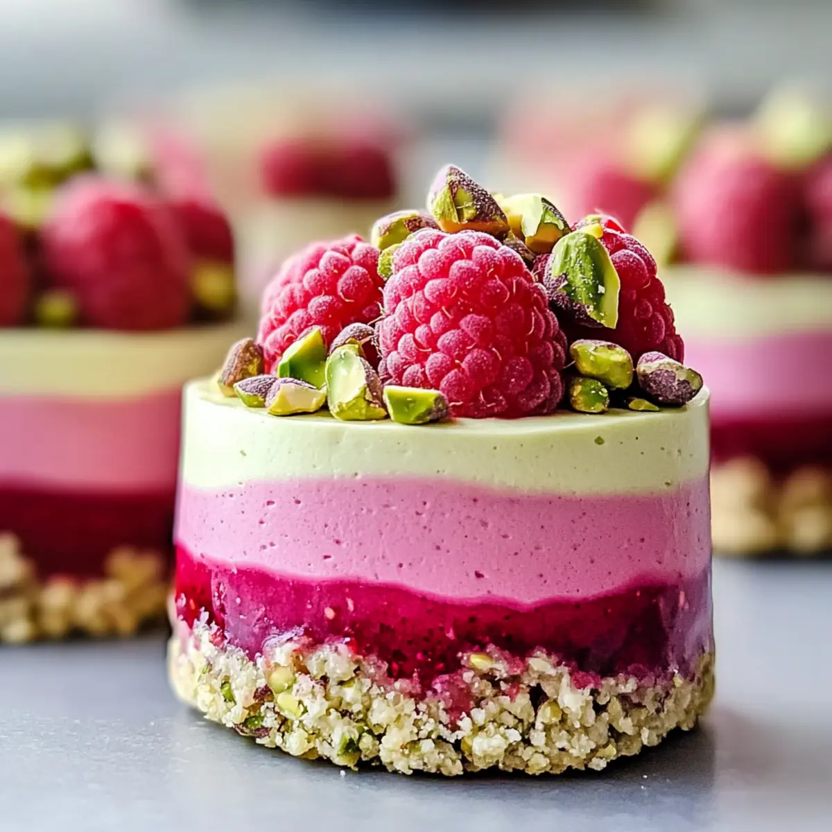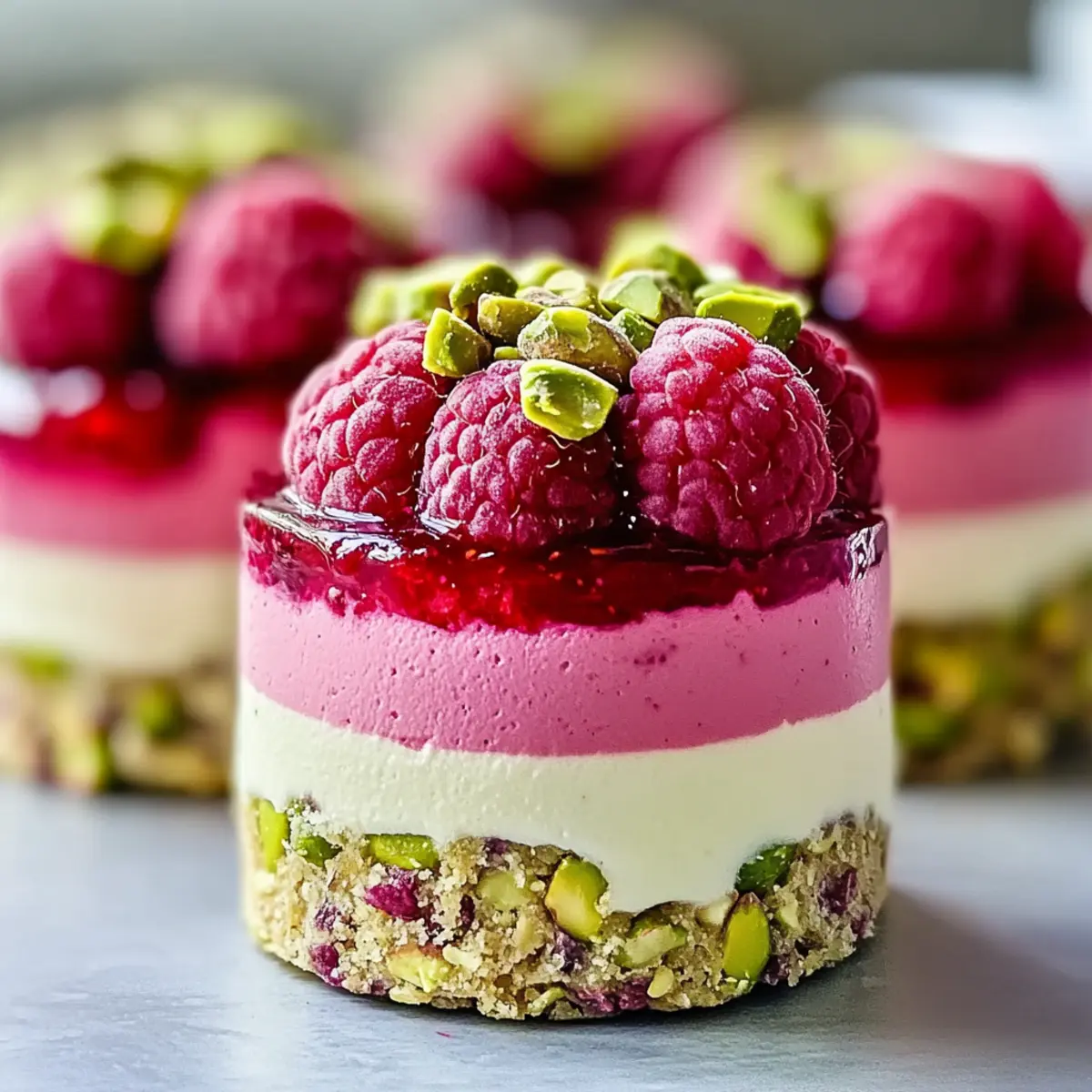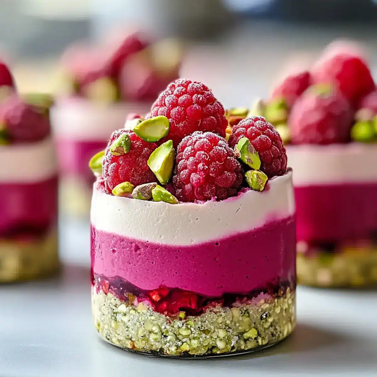 - Once set, garnish each serving with extra crushed pistachios and fresh raspberries before serving.