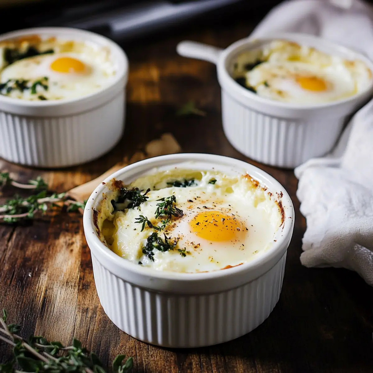 Preparing Ricotta and Thyme Baked Eggs ahead of time is a wonderful way to simplify your morning routine! You can pre-chop your spinach and prepare the ricotta mixture up to 24 hours in advance. Simply store the spinach in an airtight container and the ricotta mixture in a separate one in the refrigerator. When you’re ready to bake, just assemble the ramekins by layering the spinach and ricotta mixture, then pour in the heavy cream and crack the eggs on top. Bake as directed, and enjoy the same rich, creamy flavors with ease on your busy mornings! This method ensures you’ll savor the deliciousness of freshly baked eggs without the last-minute rush.
