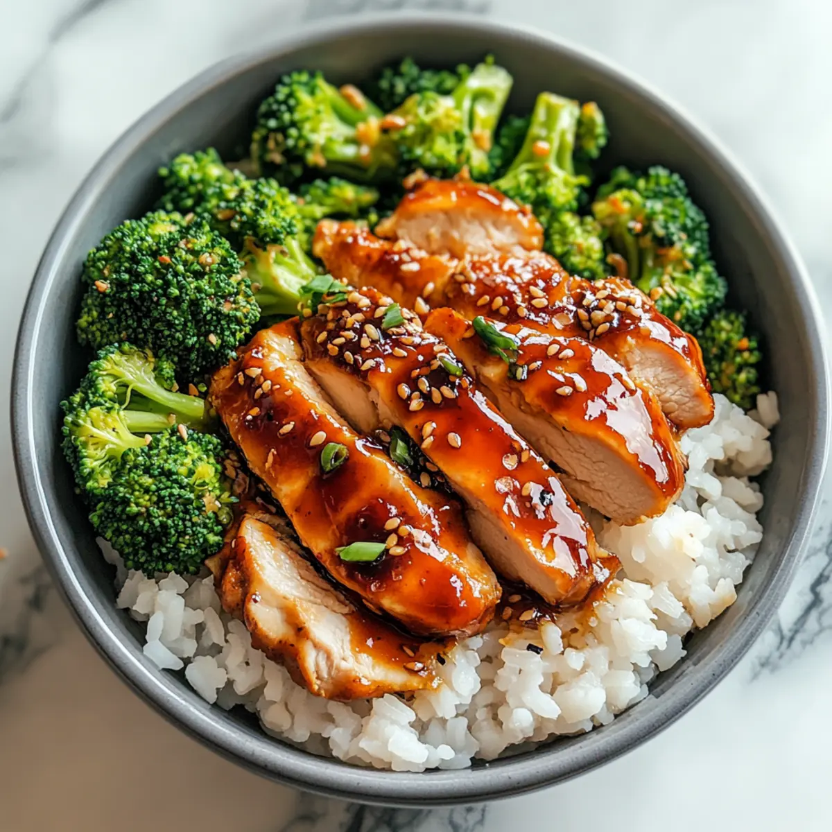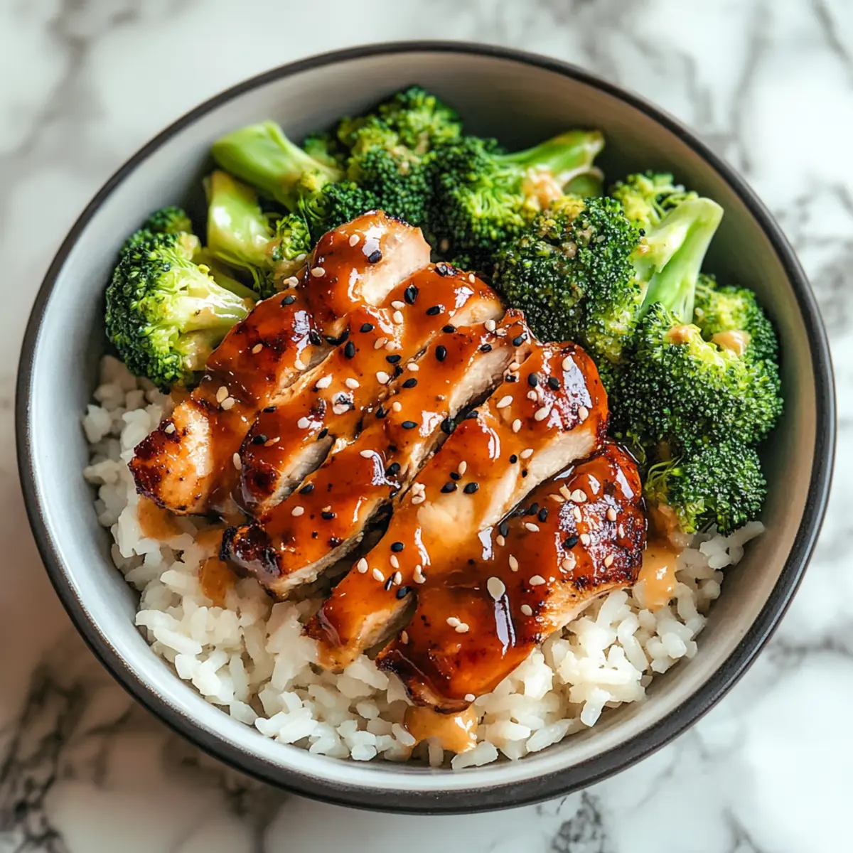 - Assemble bowls with rice, chicken, broccoli, and drizzle with spicy mayo, garnishing with sesame seeds.
