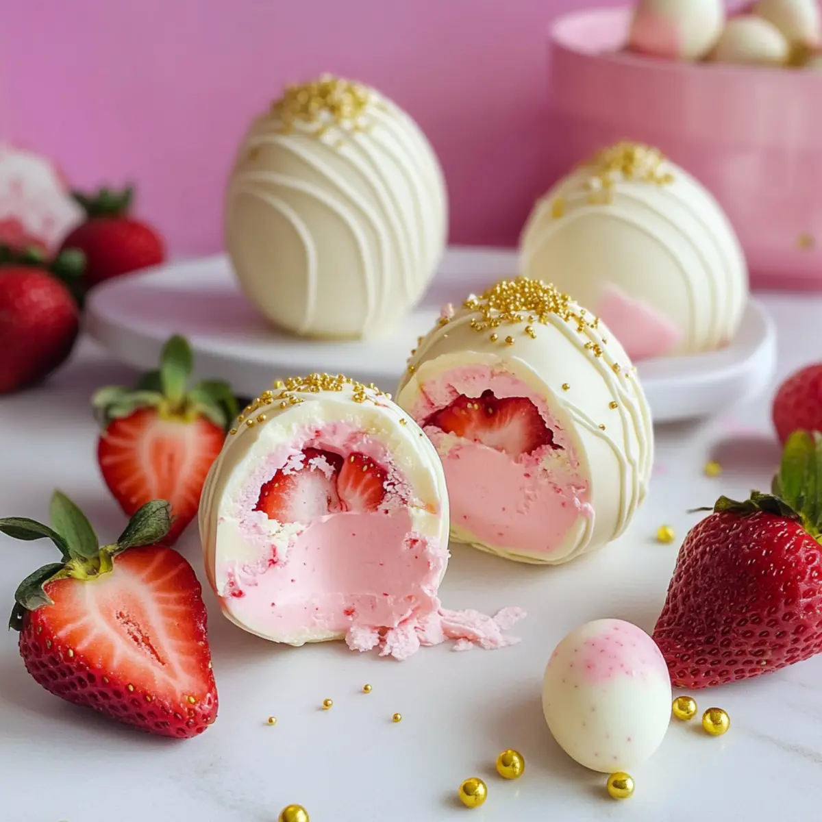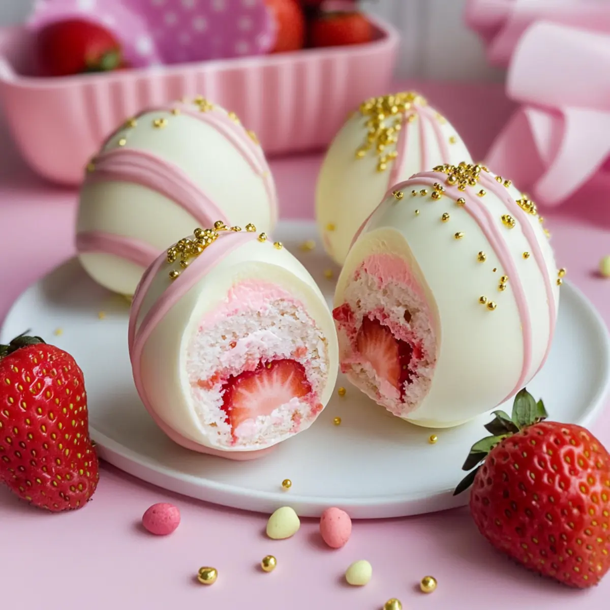 - Drizzle melted pink chocolate over the assembled eggs and sprinkle with crushed shortcake crumbs, fresh strawberry slices, and edible gold for decoration.