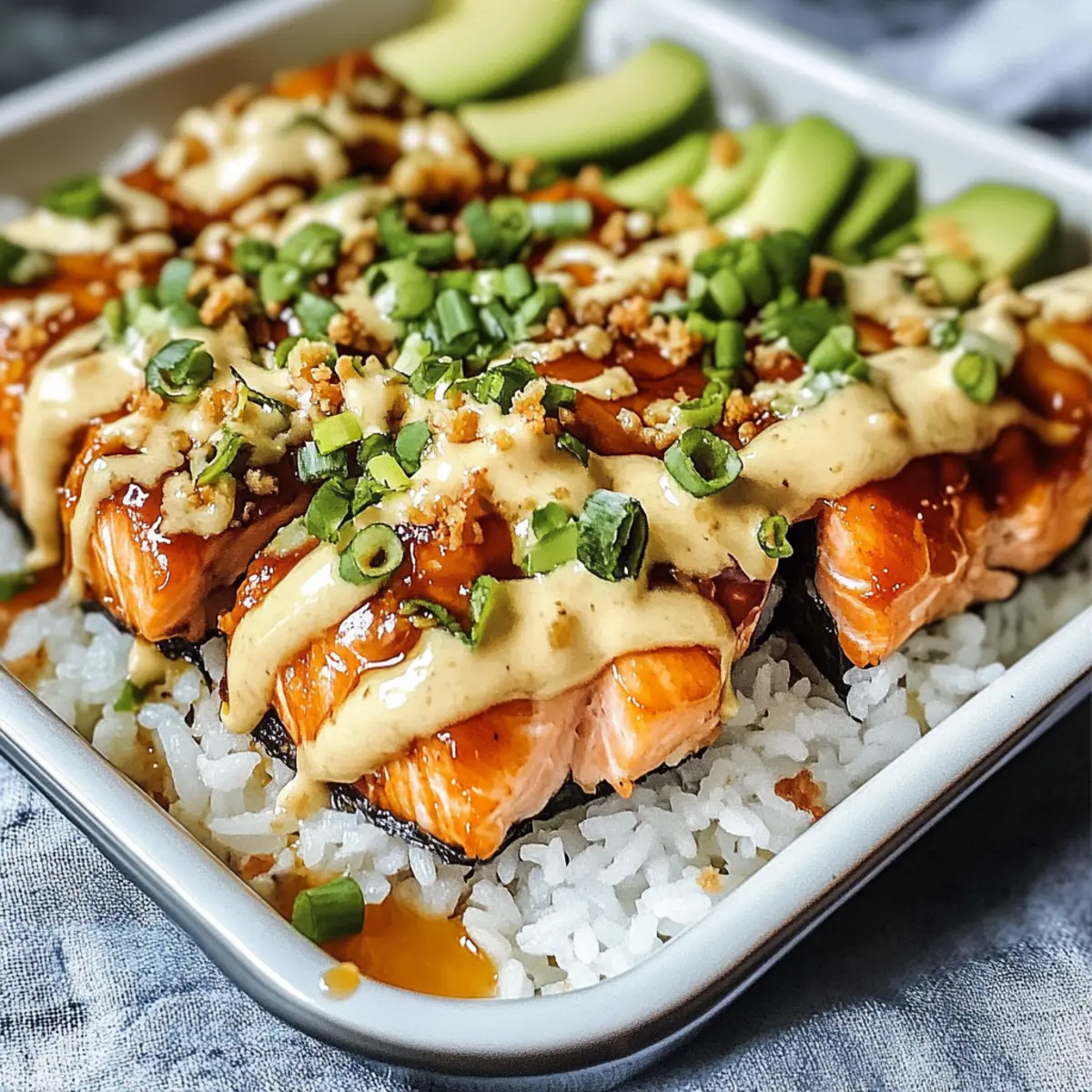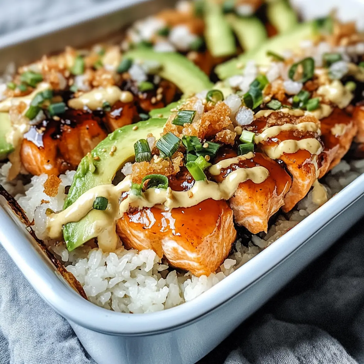 After broiling, carefully remove the baking dish from the oven. Immediately top the hot salmon with diced avocado for creaminess, drizzle with spicy mayo for a kick, and generously sprinkle with furikake, crispy fried onion bits, and chopped scallions to bring out the dish’s harmonious flavors and textures.