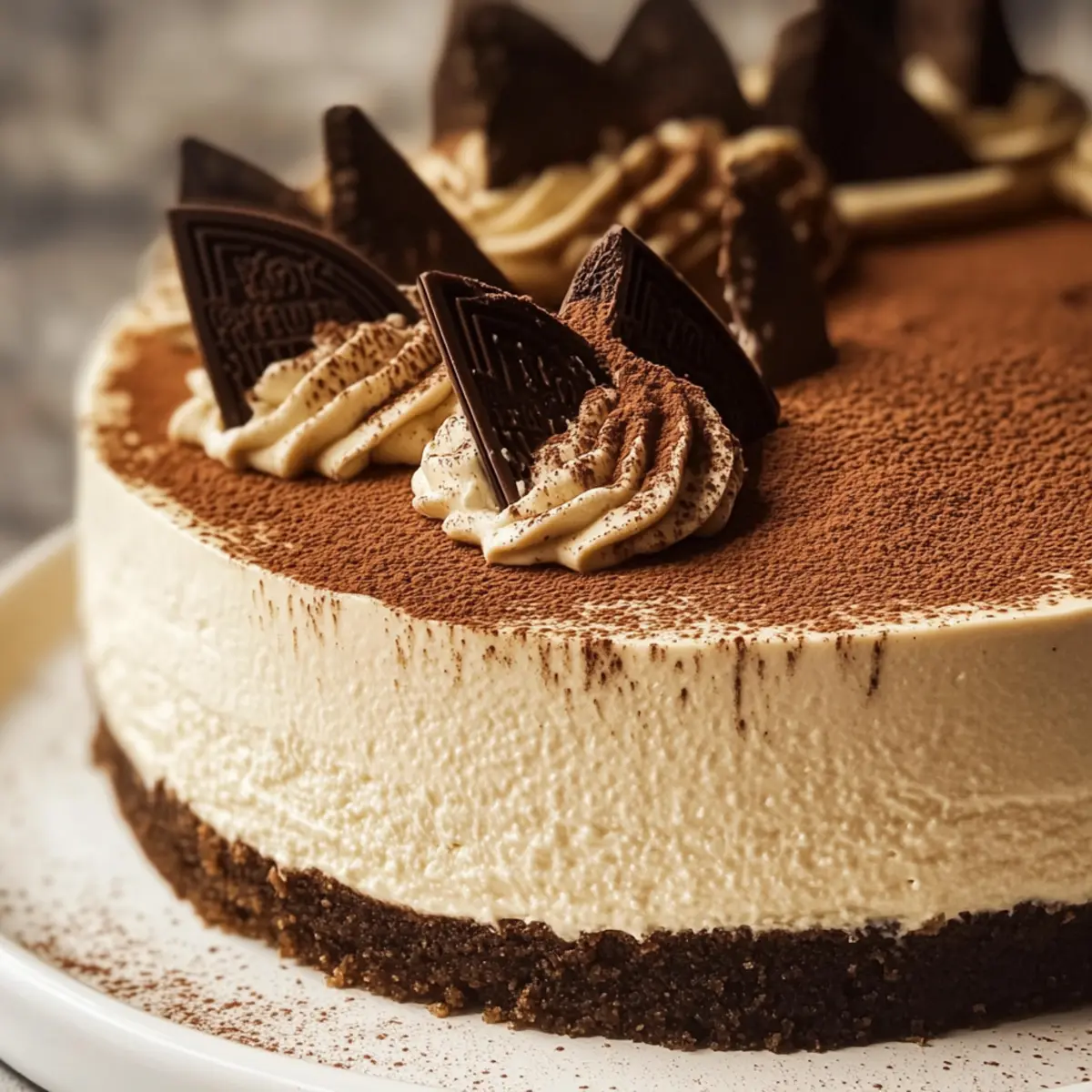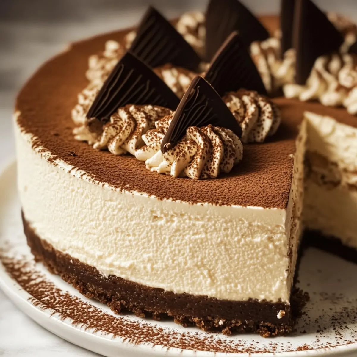 - Once chilled, remove the cheesecake from the pan and dust with cocoa powder or chocolate shavings.